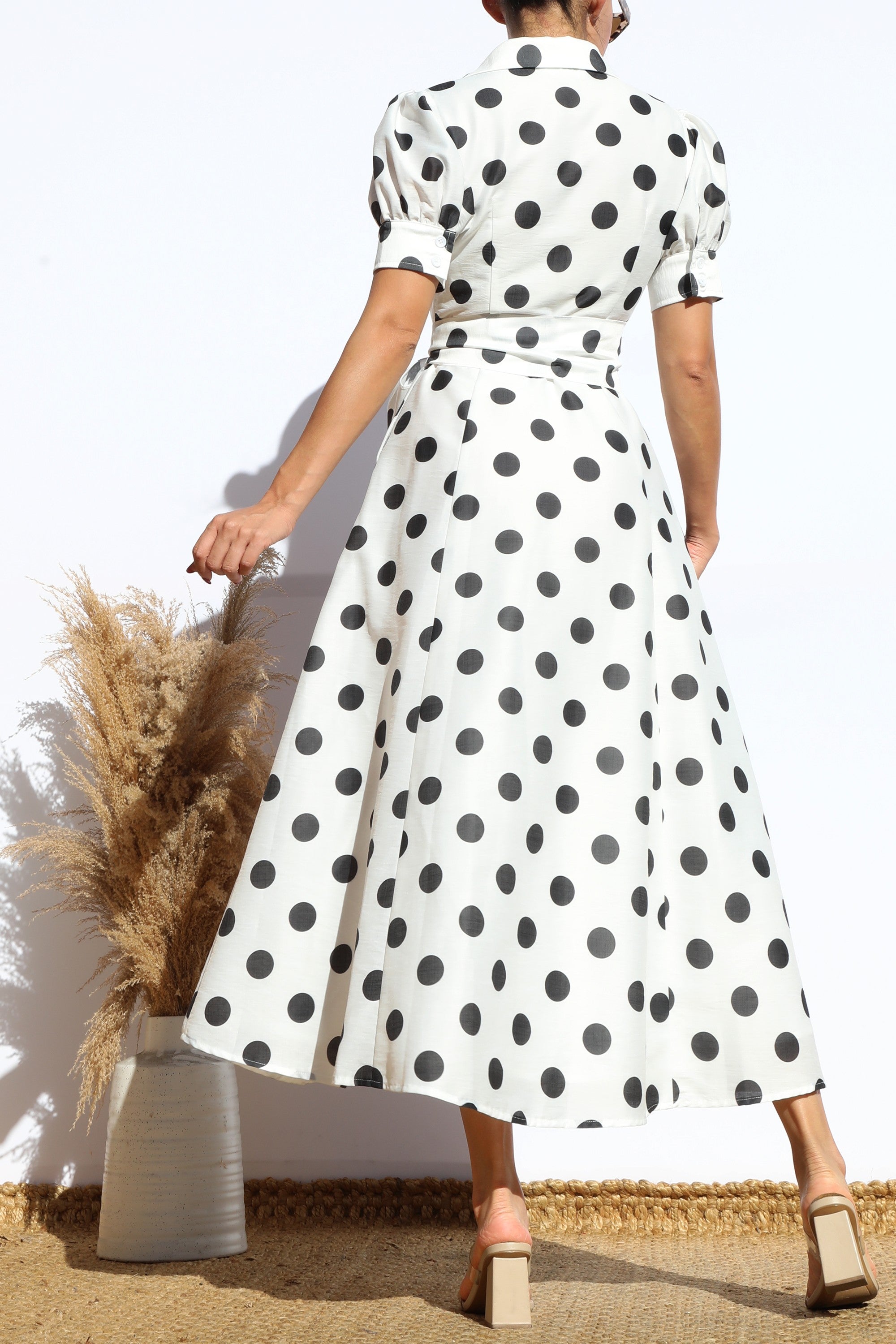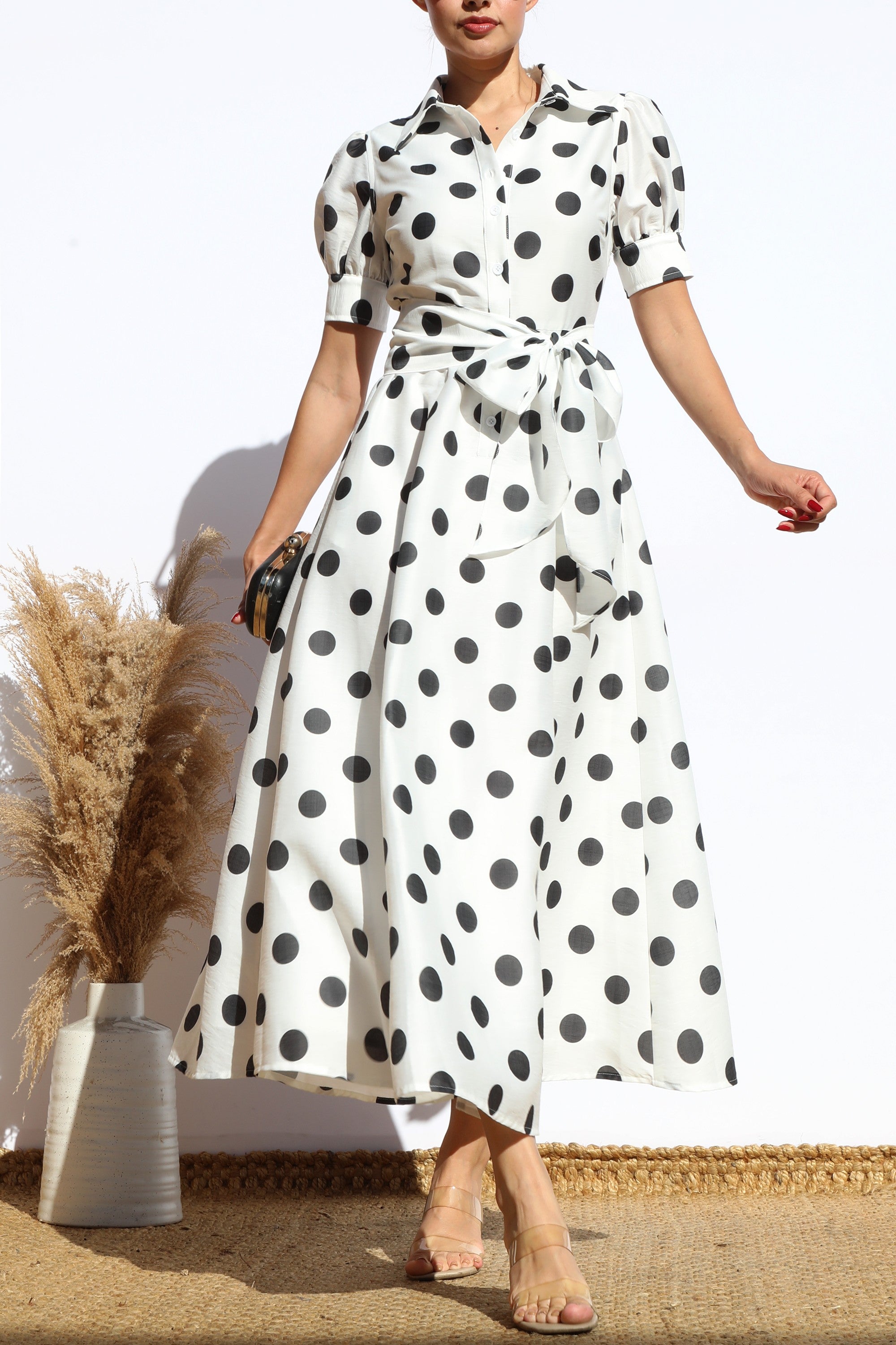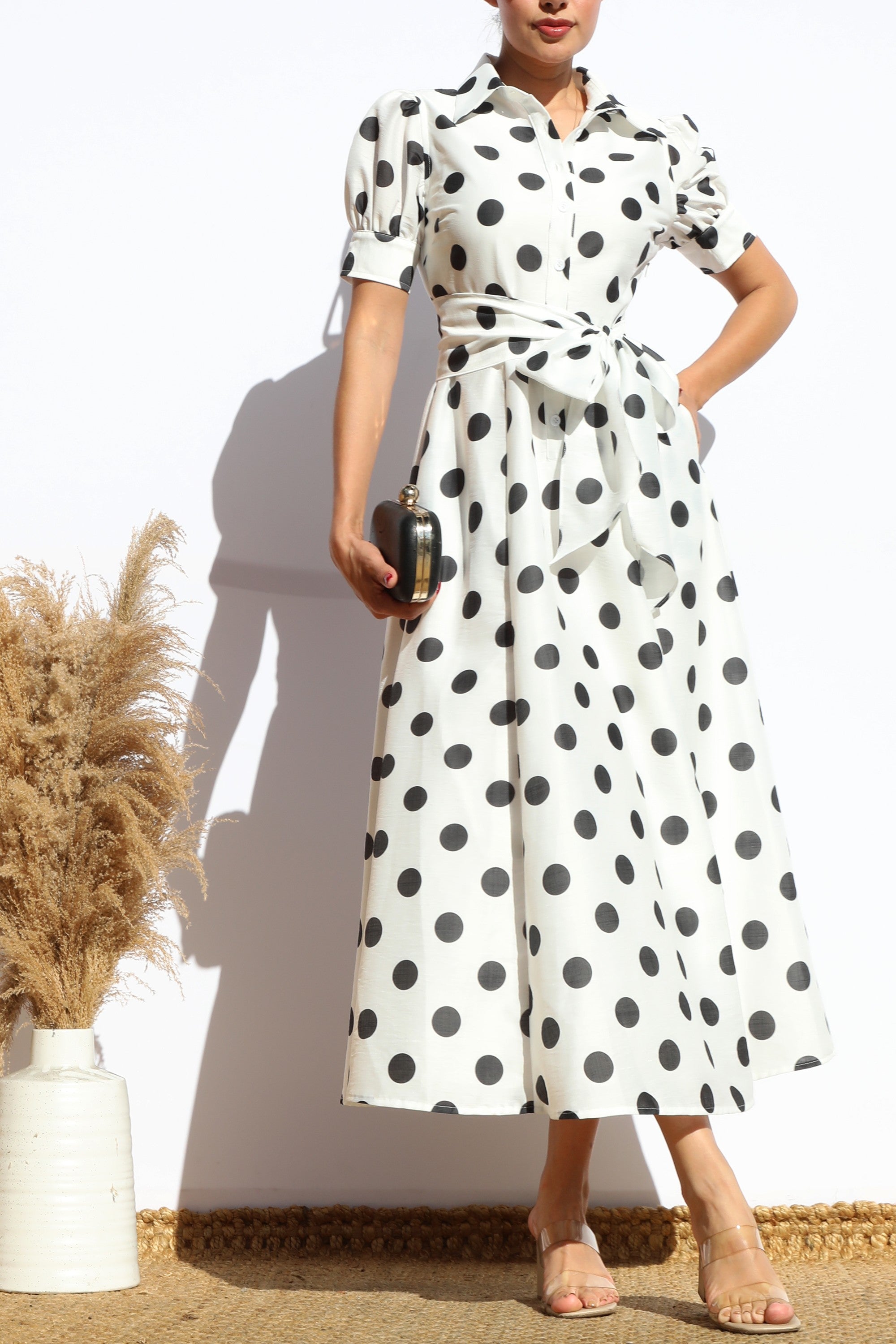 DD7975, POLKA DOT BUTTON DOWN MIDI DRESS