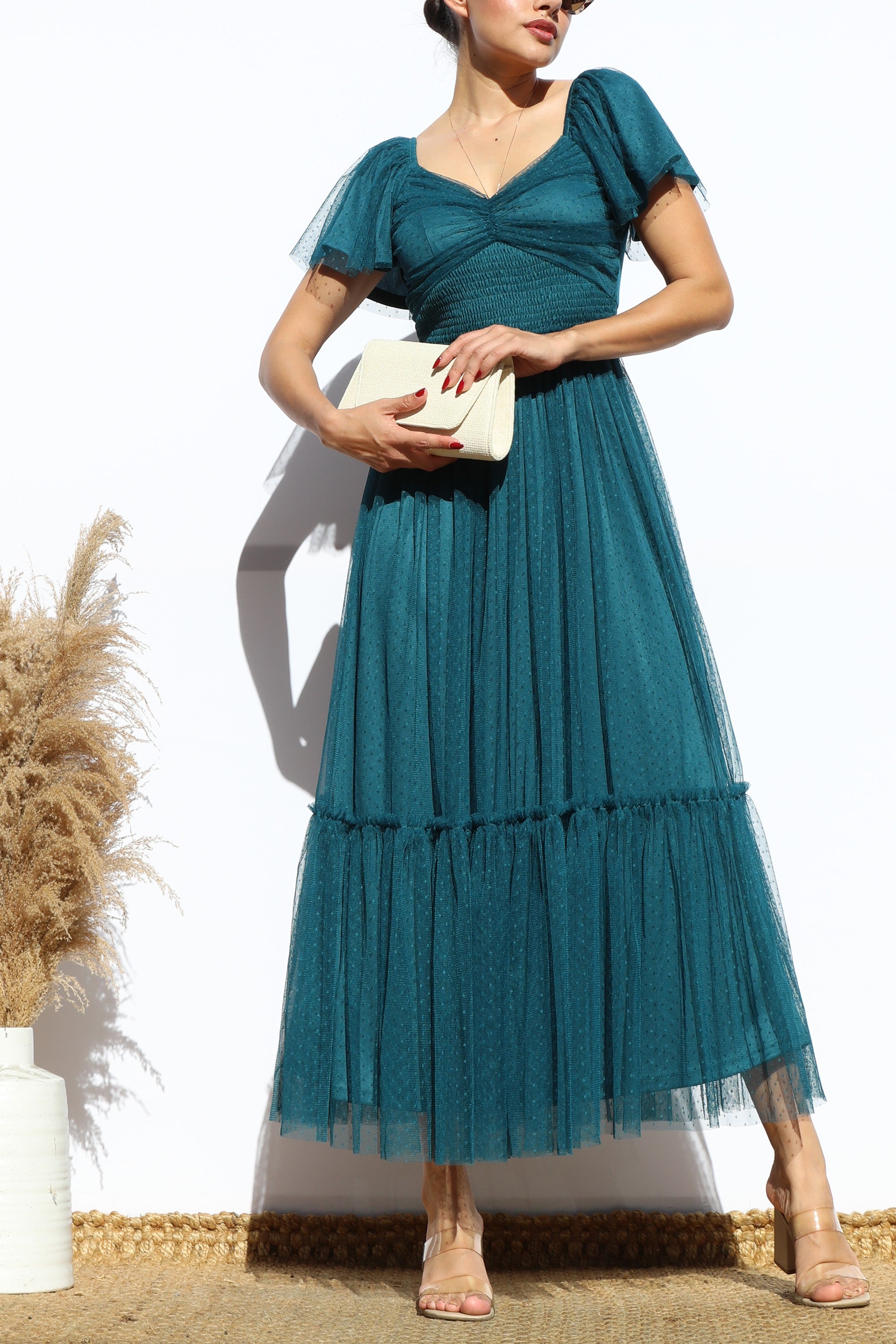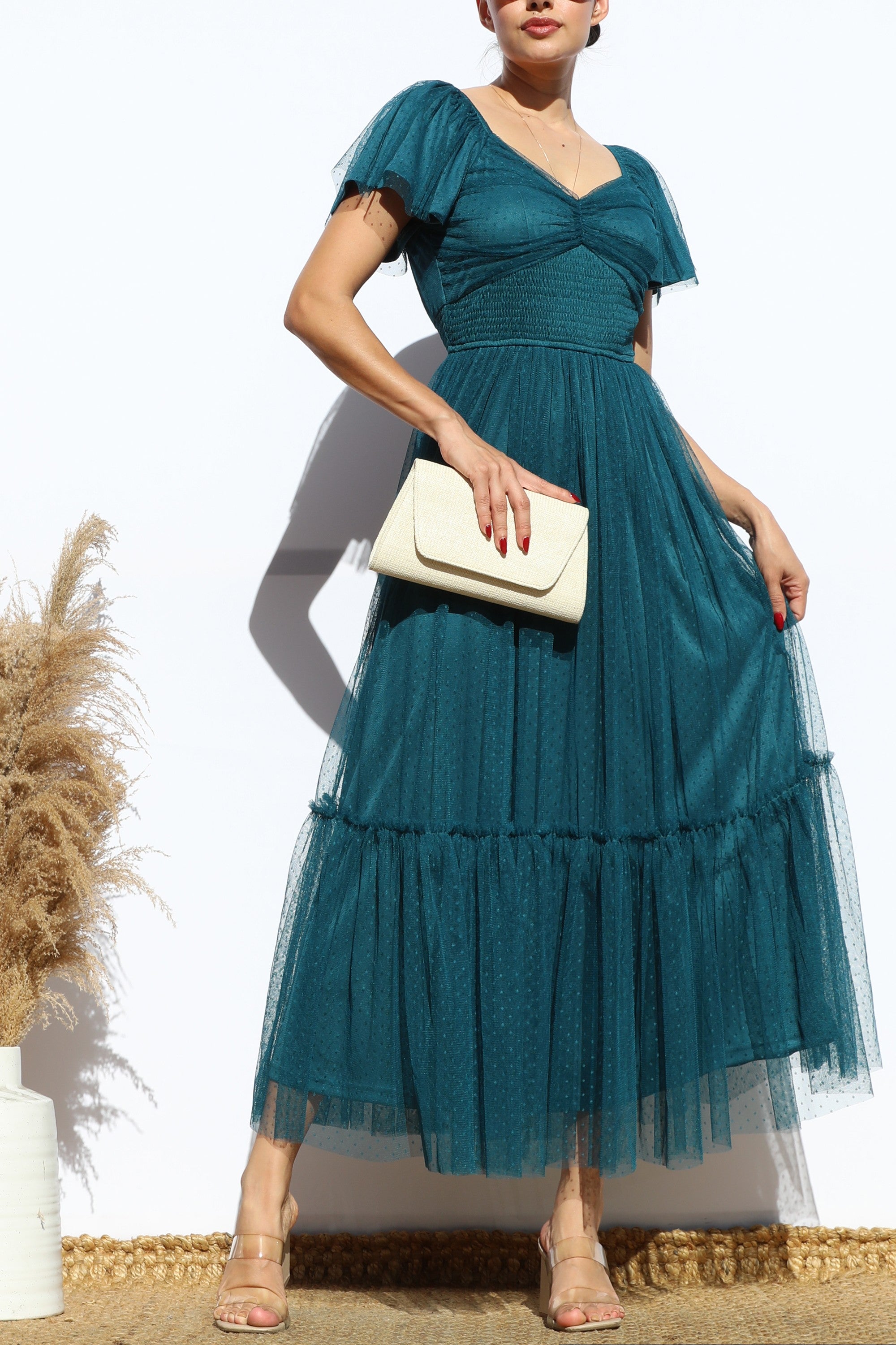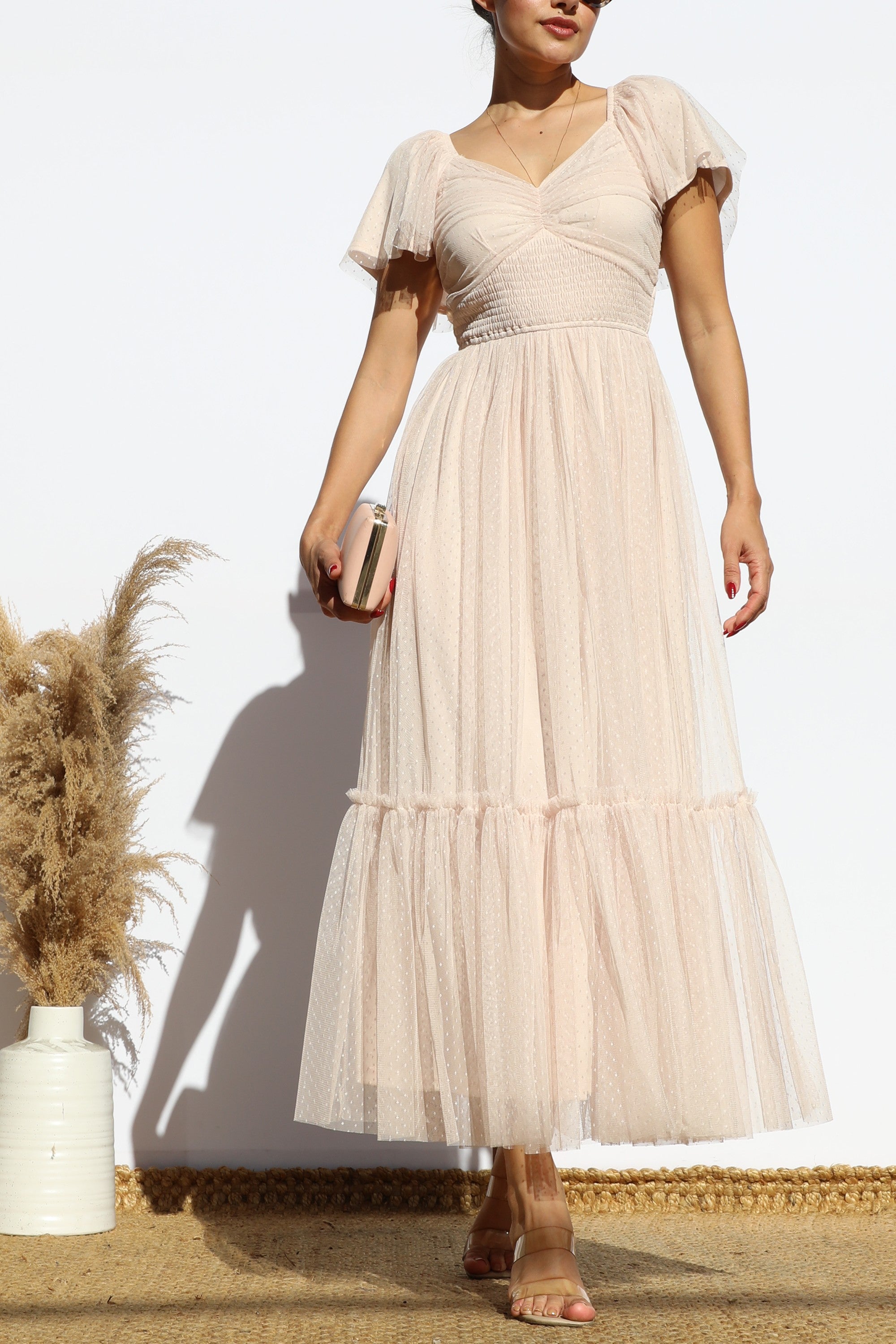 DD7791, FLUTTER SLEEVES MESH RUFFLED MIDI DRESS
