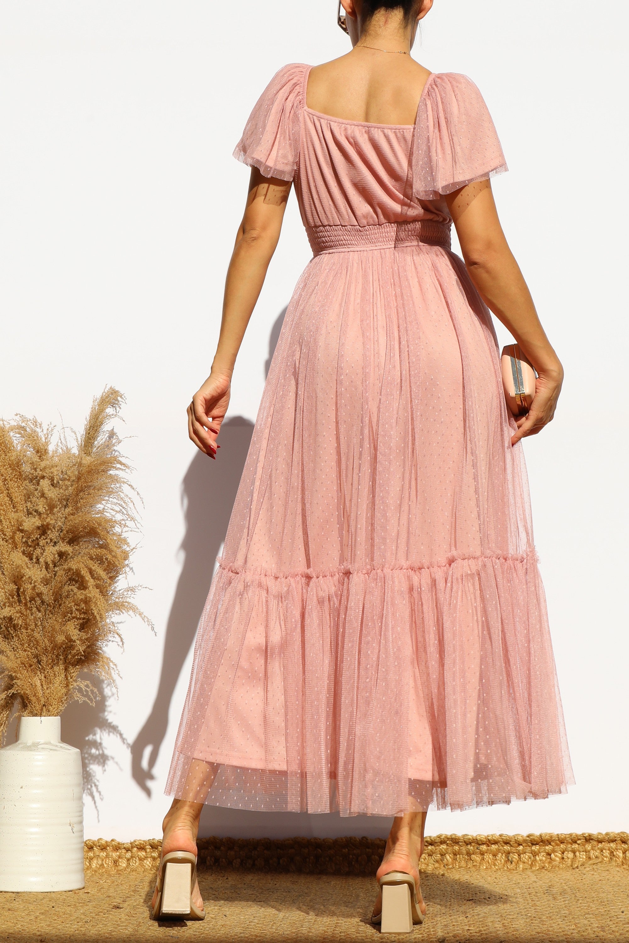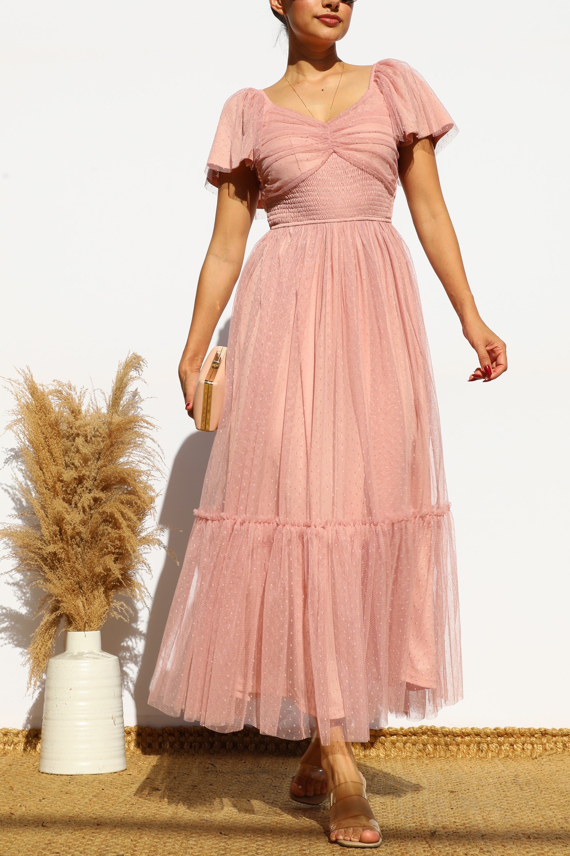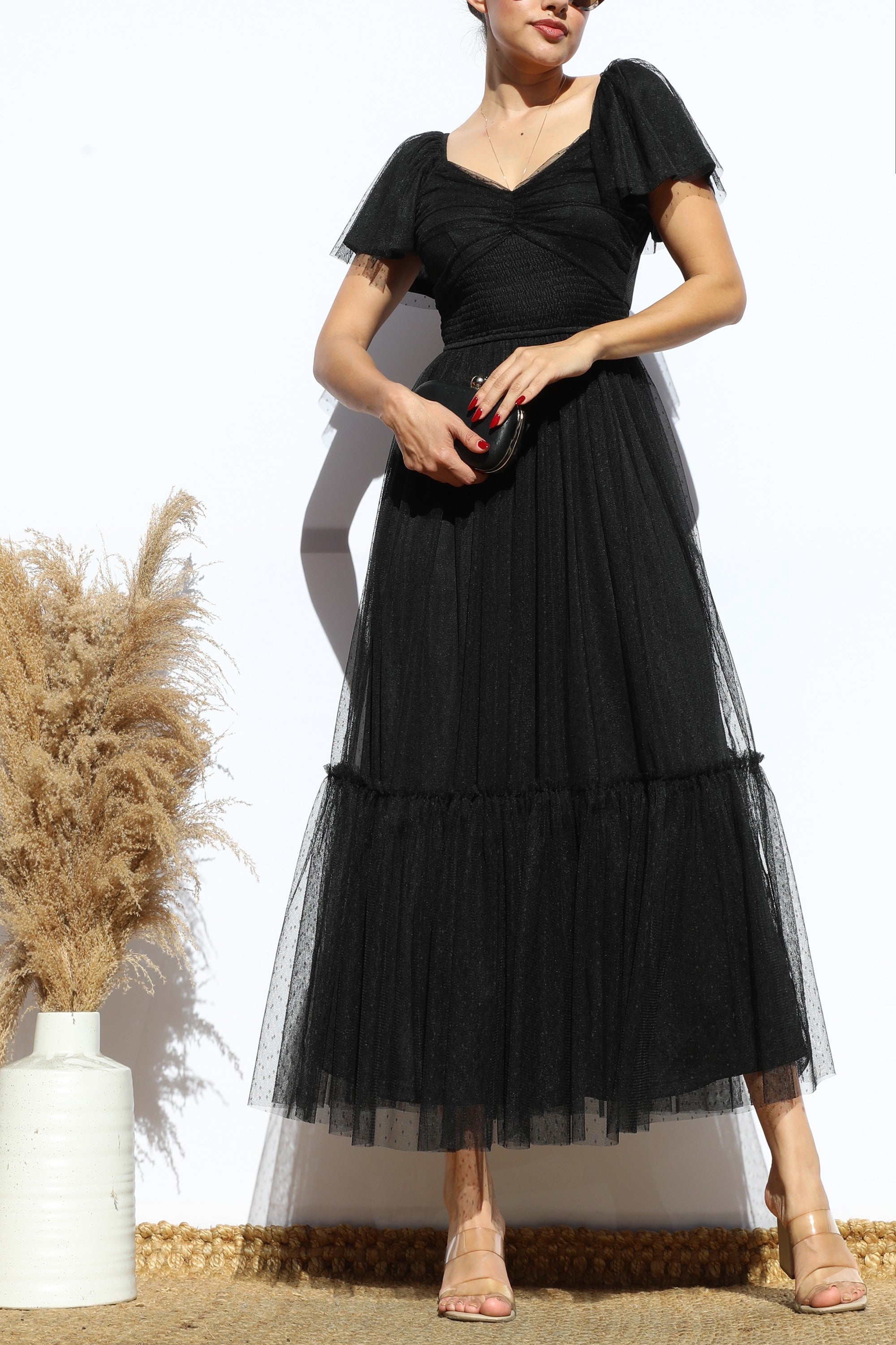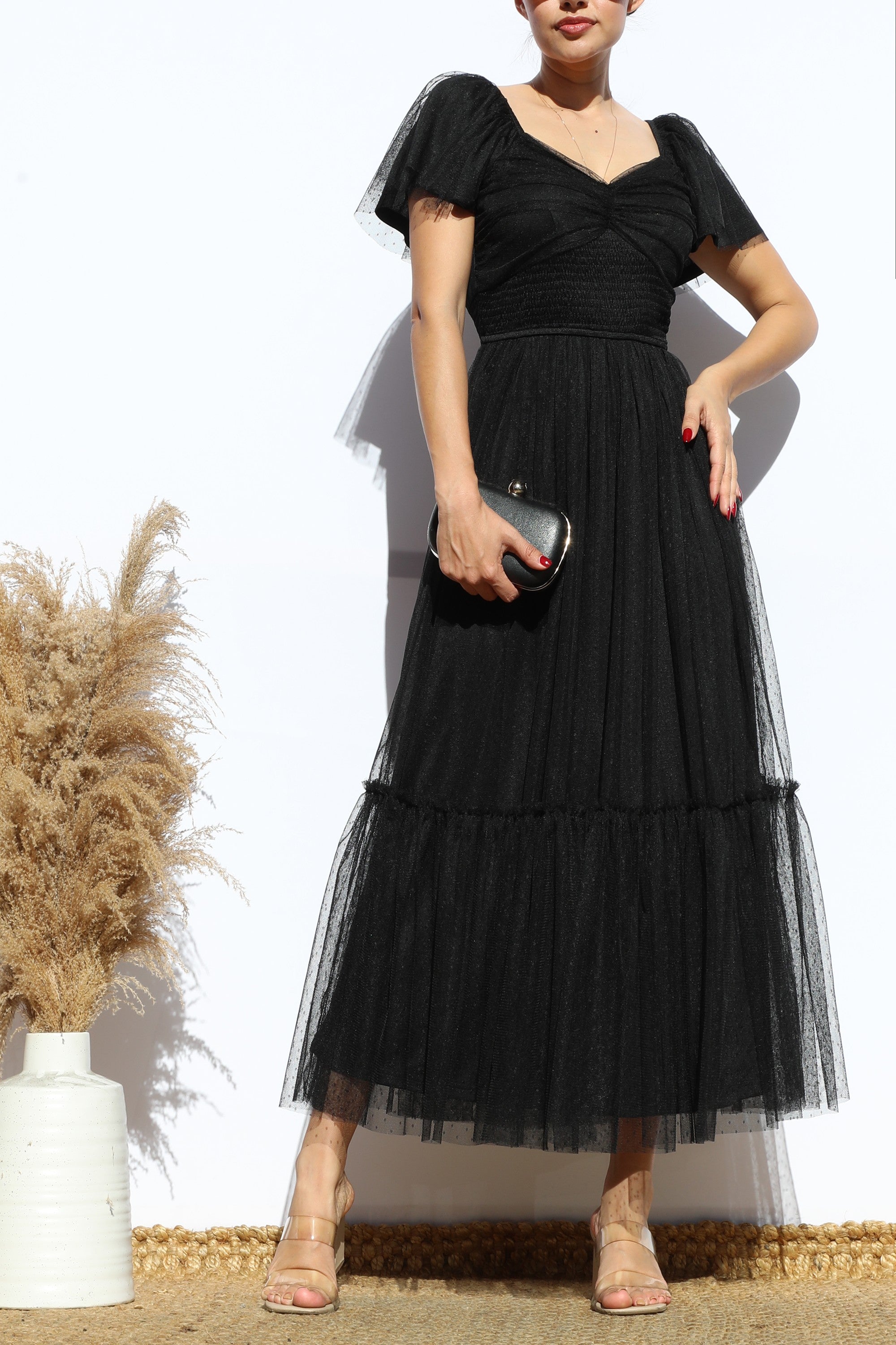 DD7791, FLUTTER SLEEVES MESH RUFFLED MIDI DRESS