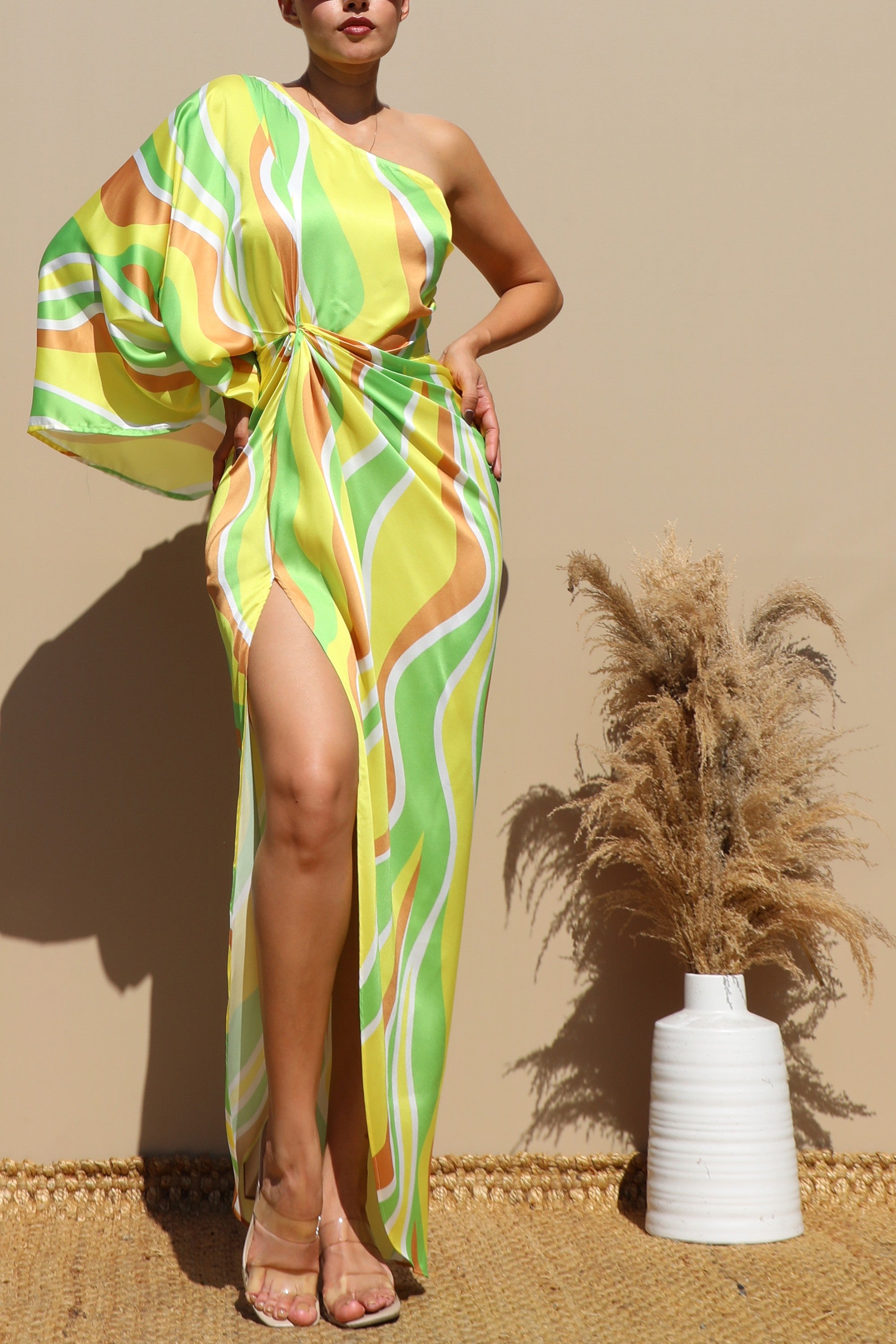 DD4647, PRINTED ONE SHOULDER SATIN MAXI DRESS