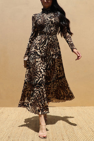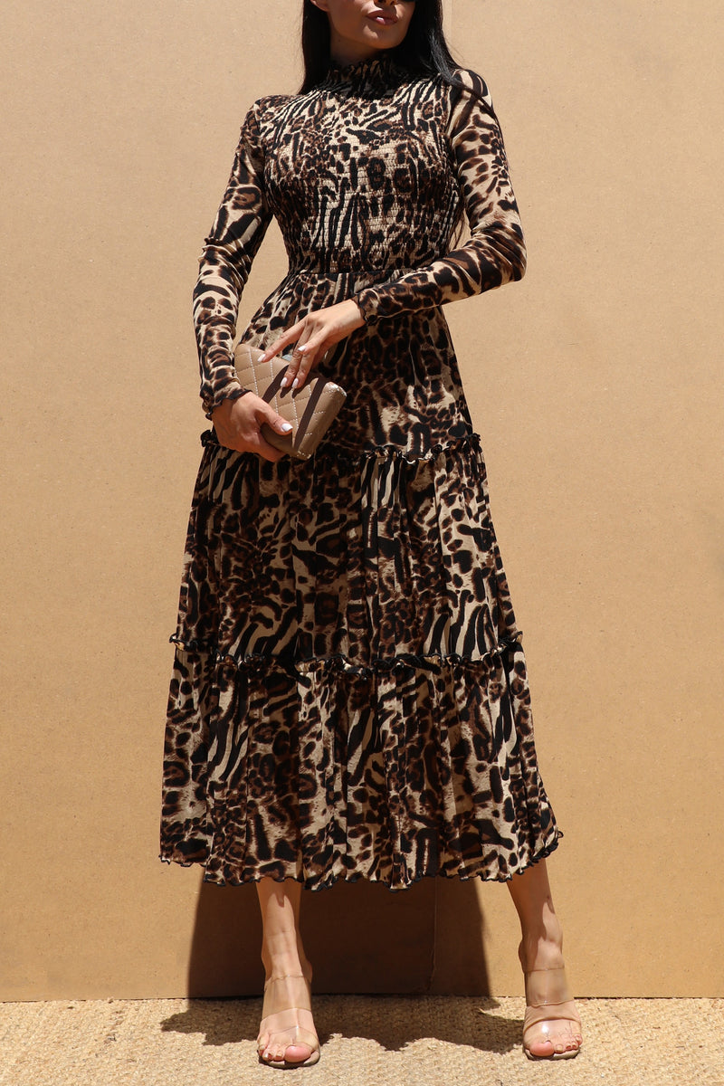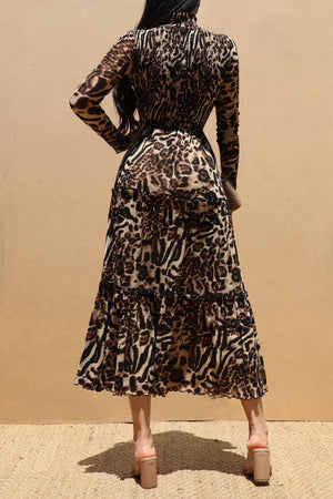 DD7537, SMOCKED MESH LEOPARD PRINT MIDI DRESS