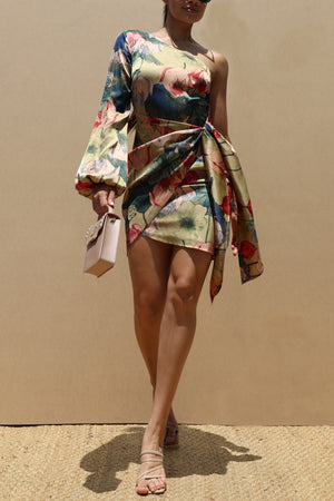 ONE SHOULDER SATIN WRAP MINI DRESS